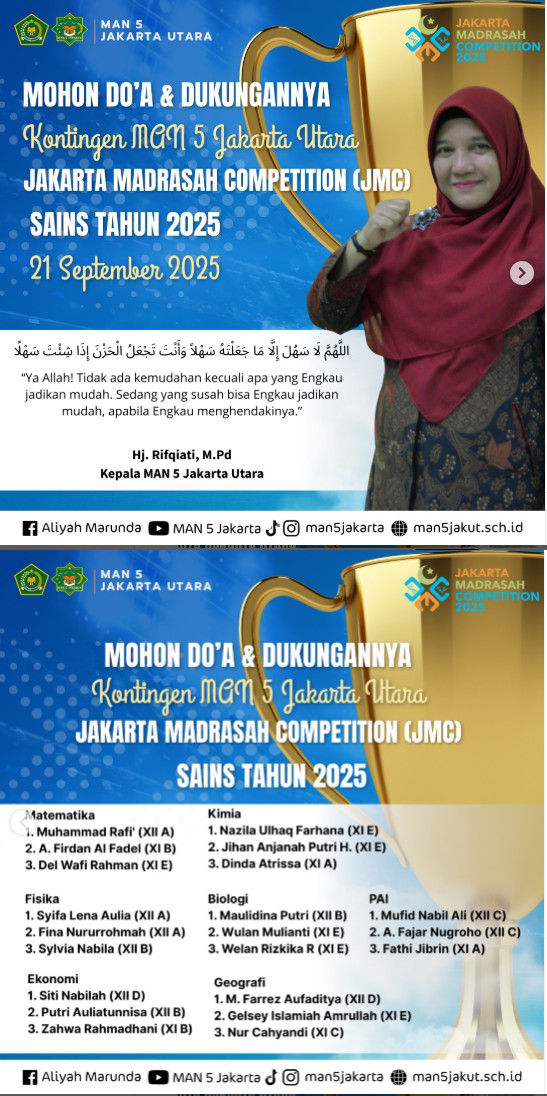 Mohon do'a dan dukungannya untuk Kontingen Jakarta Madrasah Competition (JMC) Sains yang berjuang pada 21 September 2025